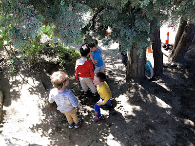 Whatever the case, in our modern world these two distinct urges get lumped together, especially in the minds of young children who, through their play, are forever attempting to tease out both personal and social meaning. Yesterday, a group of boys were huddled together in a corner of the playground they have "built" for themselves.