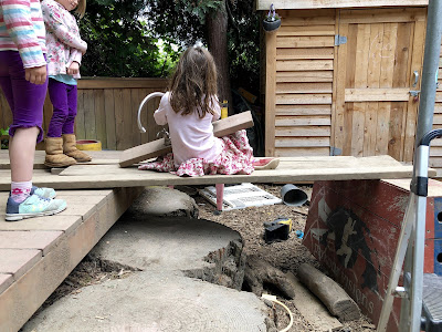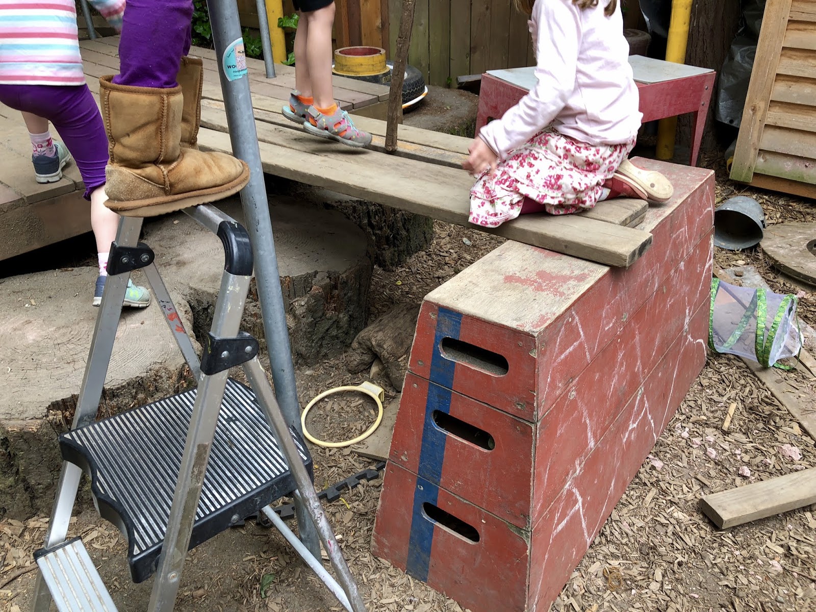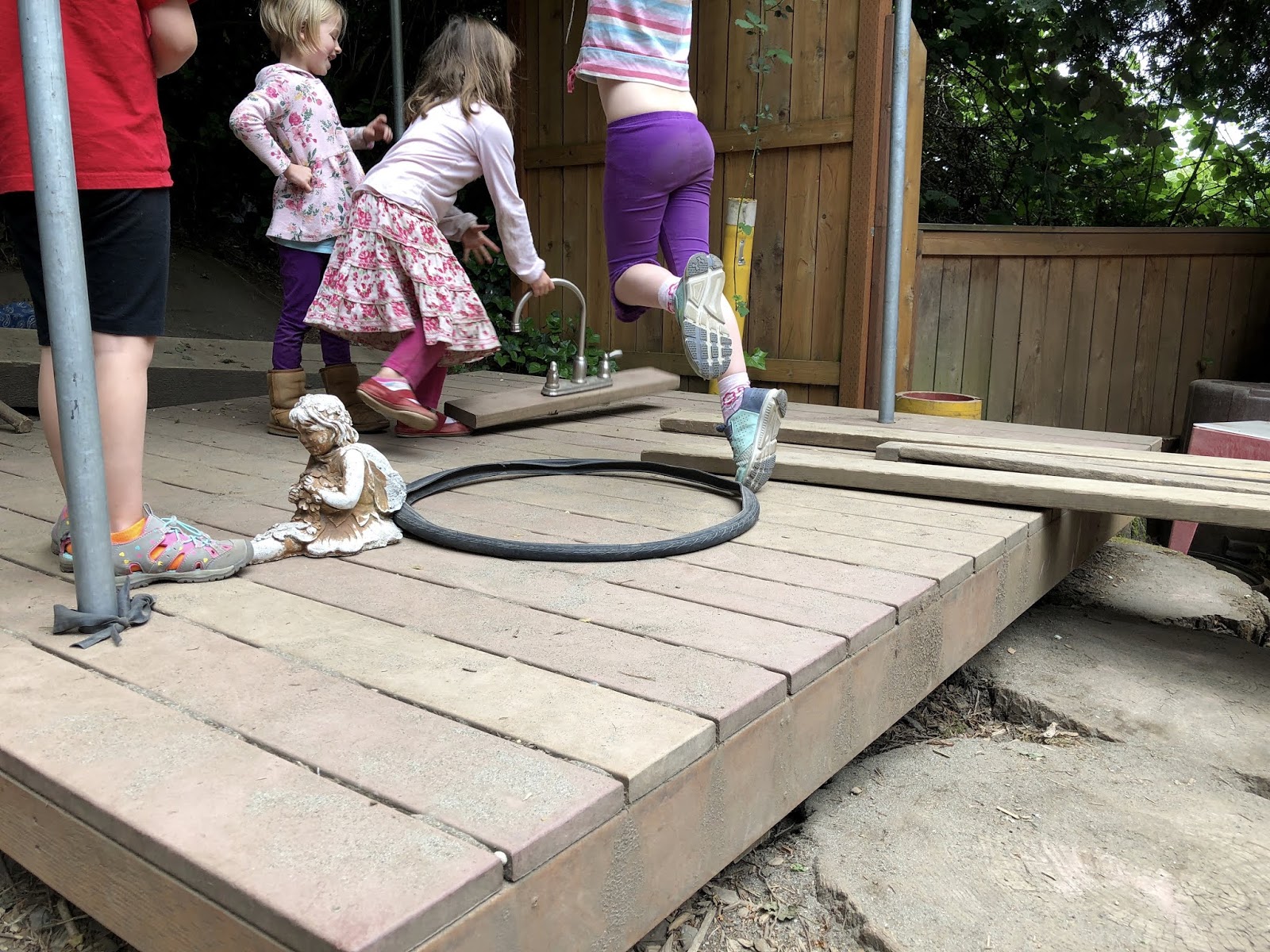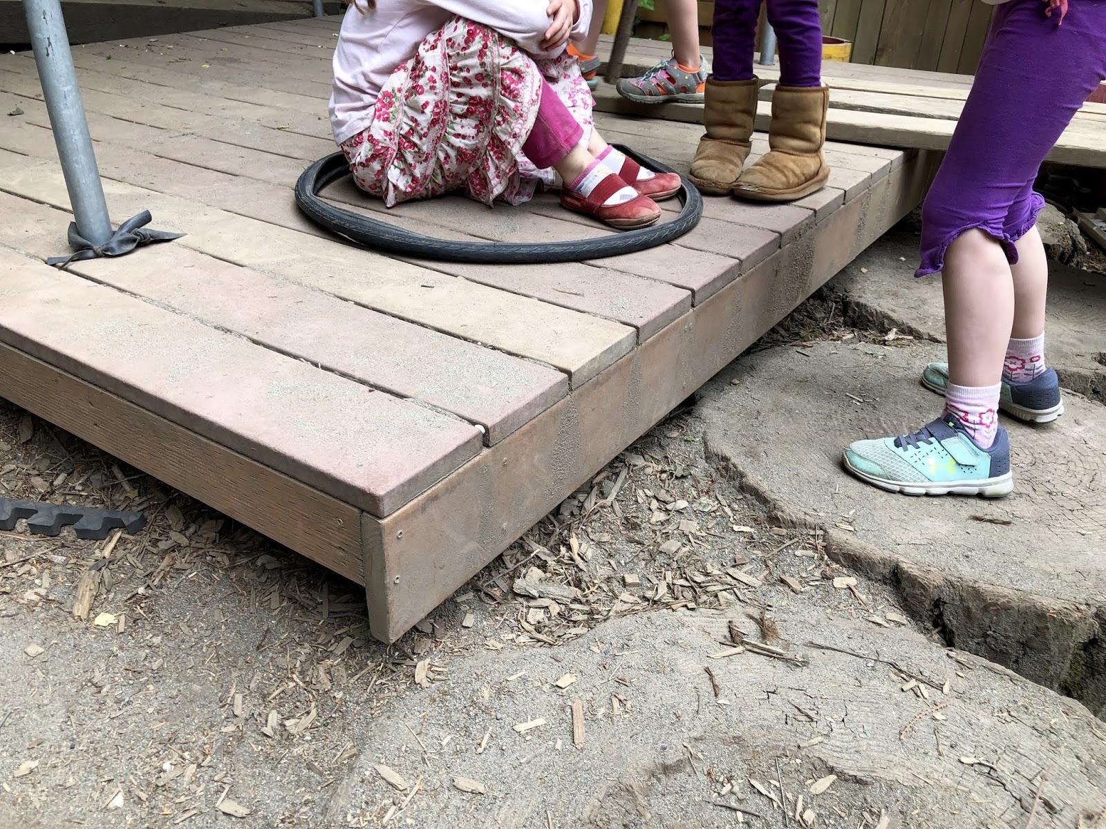 Three girls were playing together on the outdoor stage. I approached just as a fourth girl asked them, "Can I play with you?"