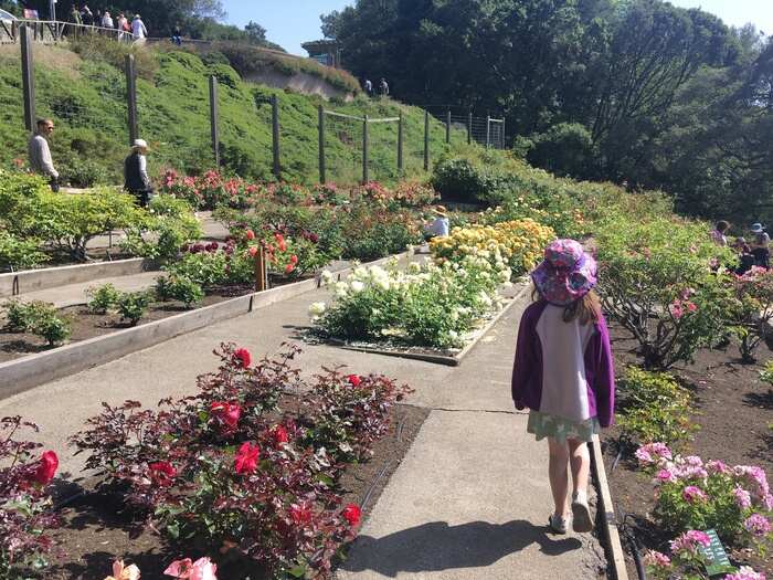 Description: Just across the street from Codornices Park, Berkeley Rose Garden is an idyllic spot in the Berkeley Hills. Families can meander down the rows and rows of roses before park time. There are also a few paths, a water feature, and a bridge to explore within the garden fence. Enjoy breathtaking views of the San Francisco Bay and the Golden Gate Bridge. Mixed-age appropriate and easy destination with visitors. Bonus points for clean restrooms on site (near tennis courts and tunnel to Codornices Park).
