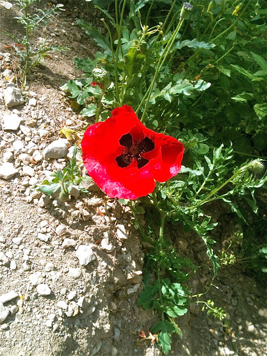 I put a piece of tissue paper on my stem and in my best imitation of the way she had done it, tore the hole a little too big, then crushing it to keep it precariously fixed in place. Sarah watched me from the corner of her eyes. "No, that's not the way," she said. "You have to do it more gently. Like this," then she showed me on her own flower.