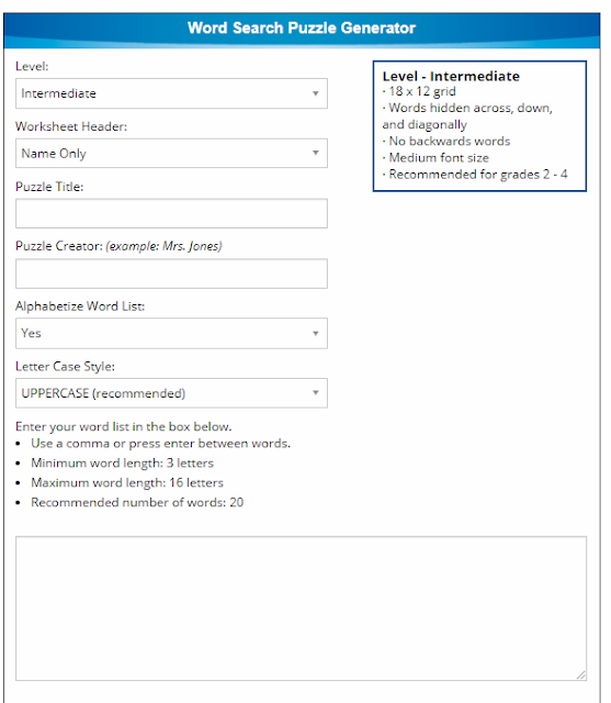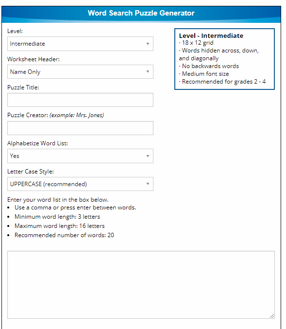 It is so easy to use this resource. You just choose your level, give it a header and a title, you can list who created it, and choose to alphabetize the word list. This is a great option, because then the parent can just enter the words and the generator alphabetizes them for you. Then you enter your word list, following the instructions.
