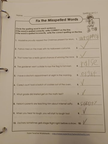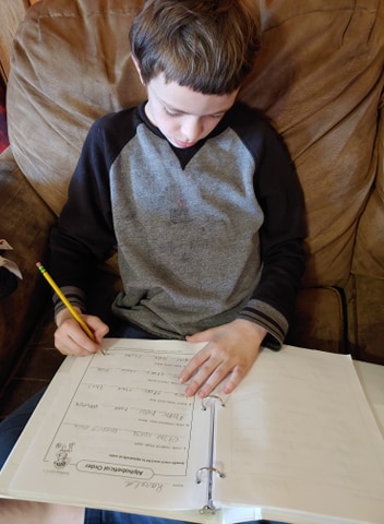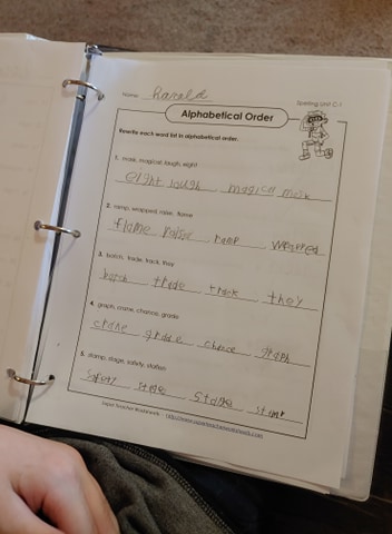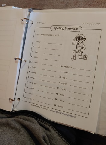 Unscrambling the spelling words. This has proven to be a bit tricky for Harold, but we will continue trying.