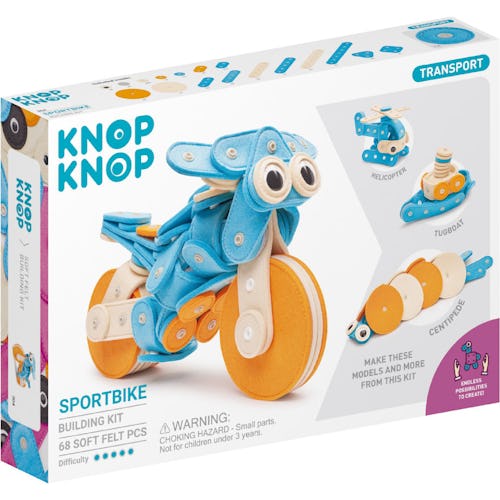 The ultimate STEM toy for open-ended play — this wonderful kit is made up of washable felt pieces kids can used to build a motorcycle, a caterpillar, or anything else they think up. The felt pieces are flexible and snap together to make creatures or cars or what have you.