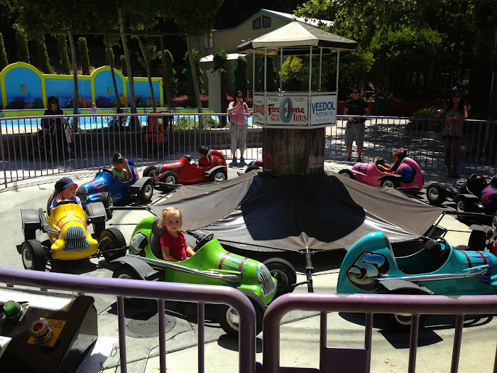 - The train (aka Coyote and Redwood Railroad). I'm listing this first because you may want to make it your first ride of the day -- the lines for the train get longer than for the other rides, so if it's a priority for you, get it done early. Plus, the train takes you on a nice loop around the whole park, so if it's your first visit, it's a great way to get your bearings. It's a fun little ride, at a good speed, with safely-enclosed carriages. We sat in the front car and, wow -- is that horn loud! If your toddler is sensitive to noises, I'd recommend sitting further back. The train also offers a bit of shade on hot days (there are canopies over the cars). No restrictions on age when accompanied by an adult.