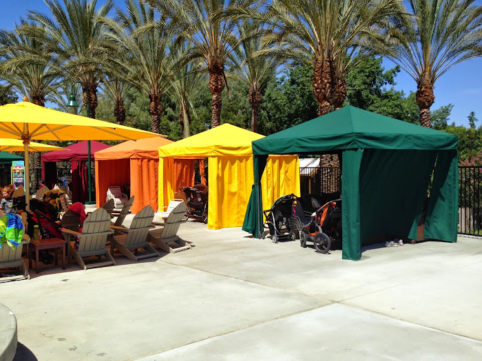 Each cabana comes with an L-shaped couch (I saw Pottery Barn tags on the pillows -- pretty swanky!), a table, four towels, four bottles of water, four lounge chairs (no need to wait for one to open up by the pool) and food and drink service to your "door". The cabanas rent for $100/day on the weekdays (summer only) and $150/day on weekends, and they can be reserved in advance or at the park, subject to availability. There is a 20% discount for Premium or Elite pass holders.