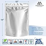 PROPREMIUM MYLAR - Standup gusset for better organization these 1 gallon bags are designed with a 393 gusset that expands allowing them to stand upright Maximize storage space and easily shuffle through labeled bags to find what you need Temp Range 0f 176f Bpa free airtight easily sealable expel air from the bag and seal with a household iron or hair straightener creating a total oxygen barrier to store spices baking powders salts dehydrated meats seeds rice pasta oats dry beans sugar and more 1 gallon 74 mil extremely thick mylar bags Propremium mylar bags are the highest quality and thickest youll find on the market Made with premium quality aluminum foil in a silver color with a thickness of 744 mil Bags are 1 gallon in volume 10 x 14