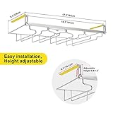 High grade 188 stainless steelour adjustable wine glass rack is made of high grade 188 stainless steel rustproof durable and not easy to deform Full metal construction design makes it sturdy and reliable Hang wine glasses safely and stably dont worry about glasses falling down and make your kitchen bar more tidy Suitable for a variety of glasses each rack can easily accommodate up to 6 to 9 glasses depending on the size of the glass Fit for multiple glass types like burgundy glasses champagne glasses cocktail glasses etc Its large enough to store your glasses for entertaining friends