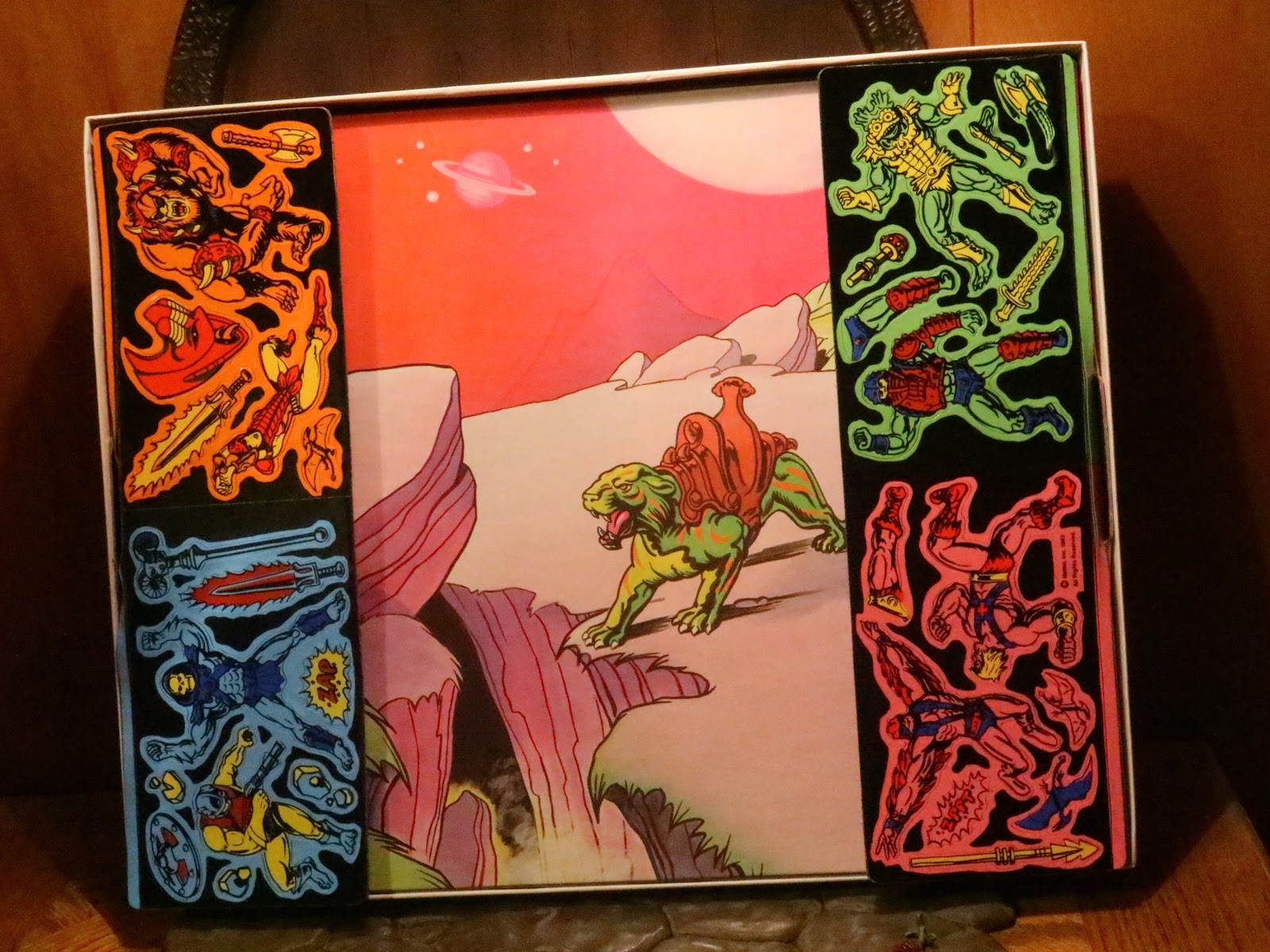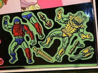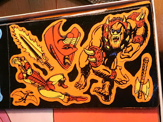 * Here's what you'll see when you open the box: The play backdrop is in the background while the cardboard wings holding the four sets of Colorforms are on the edges. If you've never played with Colorforms, they're kind of like those vinyl window decals but you could take them on and off. This set was new and only one Coloform had fallen off (the green ax near Mer-Man) so, honestly, I'm probably leaving these in place. This pickup was more for the nostalgia and the incredible box art for me.