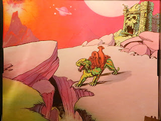 * The backdrop is a shiny cardboard scene that shows off some classic early MOTU imagery. You've got Castle Grayskull, lots of rocks with purple and pink hues, a massive volcano in the background, and Battle Cat hanging out near a deep ravine. It really does look like a background from one of the early minicomics, doesn't it? It's also interesting that Battle Cat looks like the toy. He's posed just like the toy!
