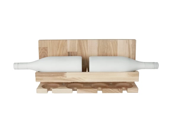 Wooden wall wine bottle holder. The holder has been designed to hold 2 standard size wine bottles and 4 wine glasses - perfect for one or two couples or a group of friends. The bottle holder is made of solid ash and is very strong and durable. The simple and functional design will save space on both the table and the wall. Perfect as a home decoration or a gift for the home.